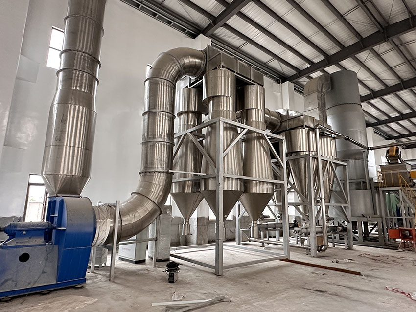 分級與收集:干燥室內(nèi)的分級環(huán)會攔截未達(dá)標(biāo)的粗顆粒物料,使其回落至底部繼續(xù)破碎干燥;符合粒度要求的細(xì)粉隨氣流從頂部排出,經(jīng)旋風(fēng)分離器和布袋除塵器依次分離收集,尾氣達(dá)標(biāo)排放。
